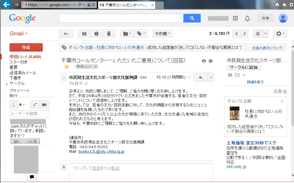 >さて、平成26年4月28日付けでいただきました千葉市が後援する、若者の文化・芸術イベントについて返信申し上げます。
